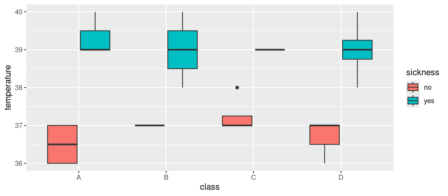 group_by() with multiple groupsJust like our boxplot, we want to know the median temperature of the students, grouped by their Class and Sickness status